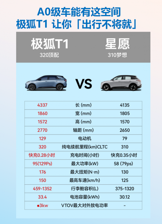 先看车身尺寸与空间布局,极狐 T1 的长宽高分别为 4337mm、1860mm、1572mm,轴距更是达到 2770mm。对比来看,MG4 轴距为 2750mm,星愿轴距仅 2650mm。从数据维度分析,极狐 T1 的轴距优势虽看似仅几厘米,但对车内空间的影响显著 —— 更长的轴距能直接转化为更充裕的后排腿部活动范围,尤其适合家庭出行时,为后排乘客提供舒展的乘坐条件。